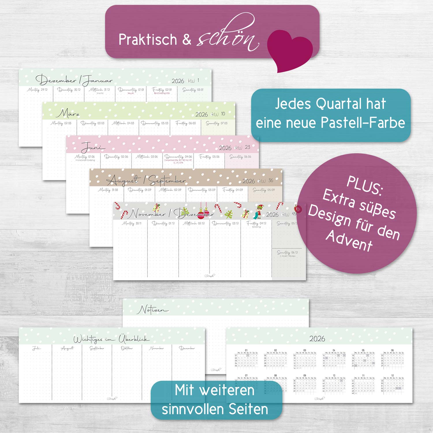 - 1 Seite pro Woche plus Jahres- und Monatsübersichten