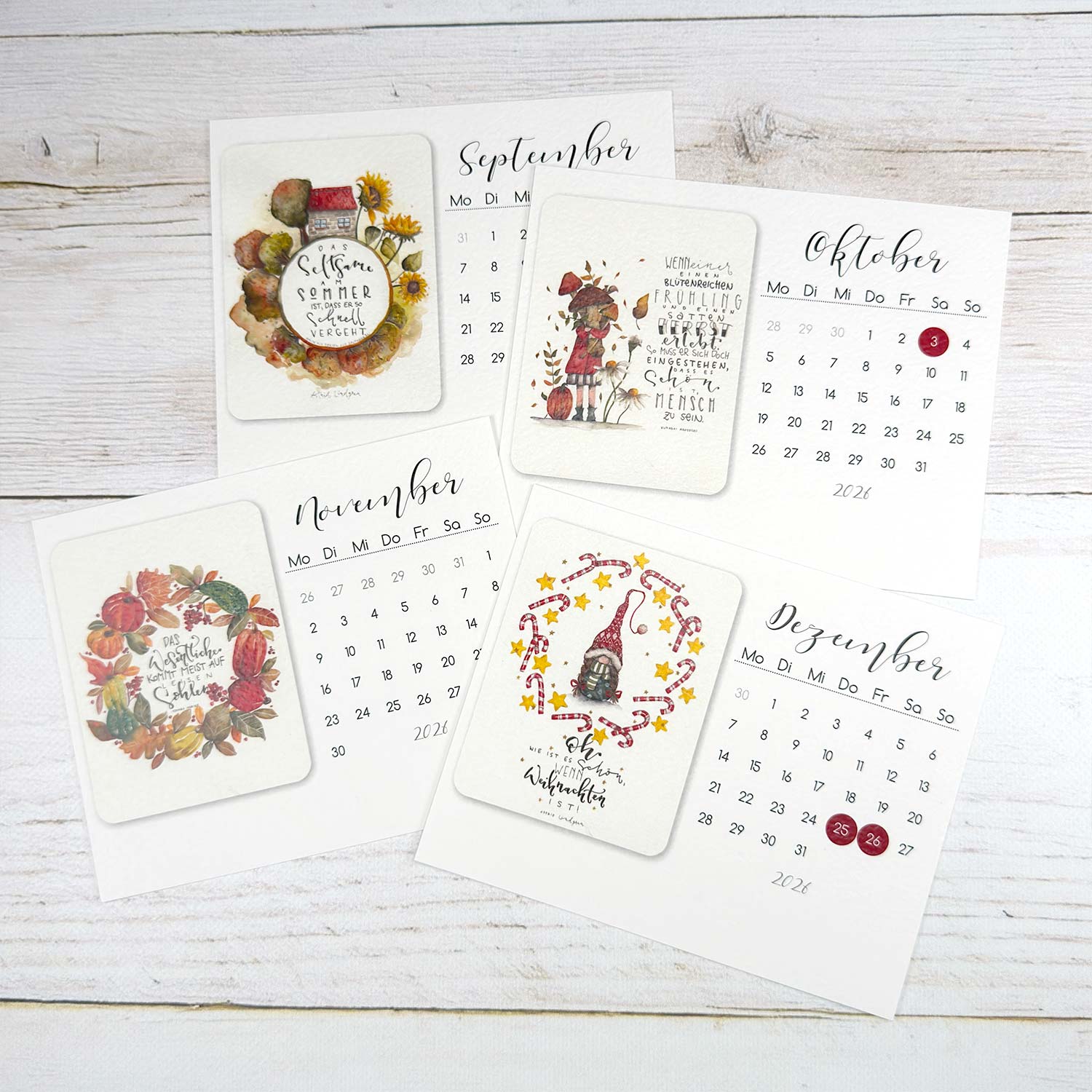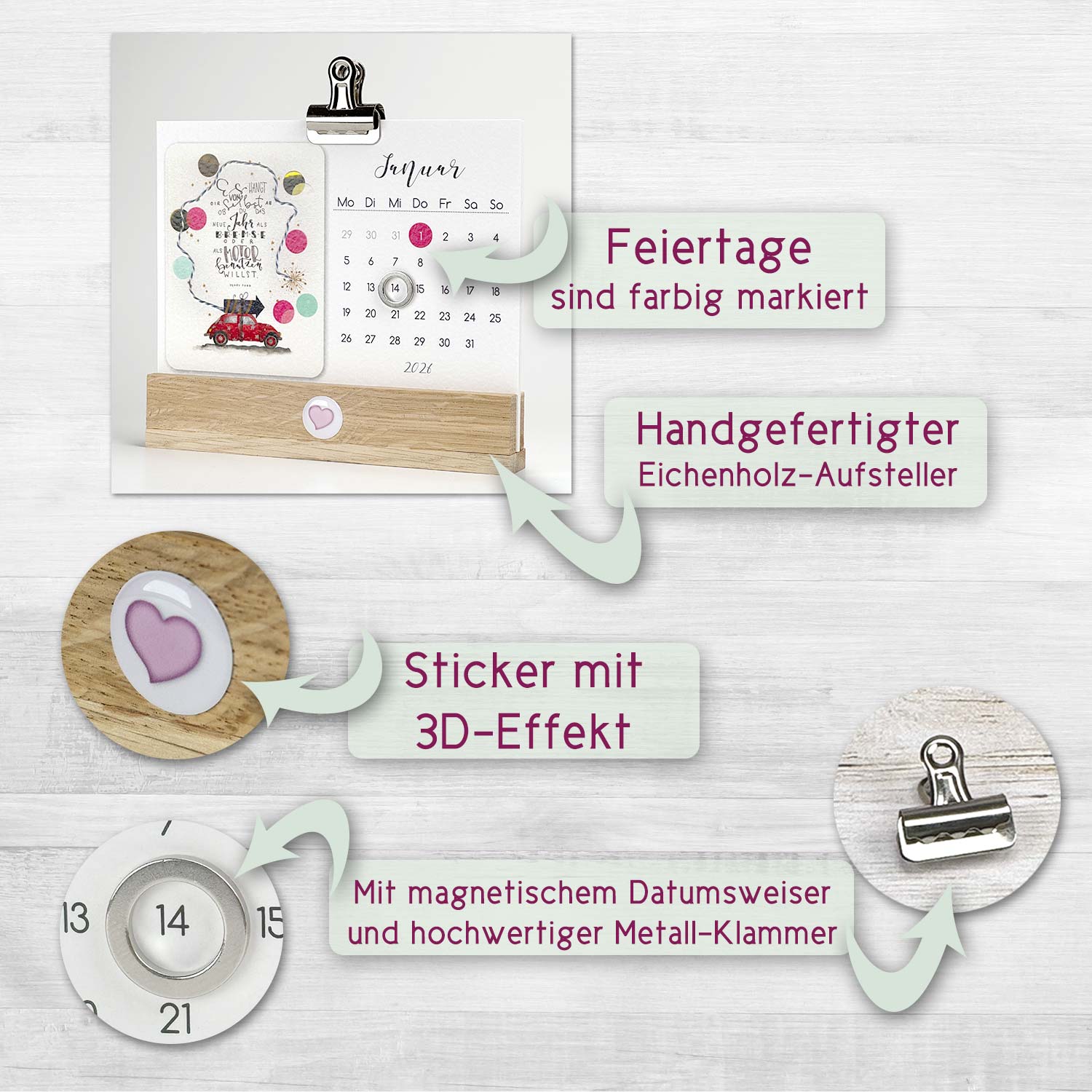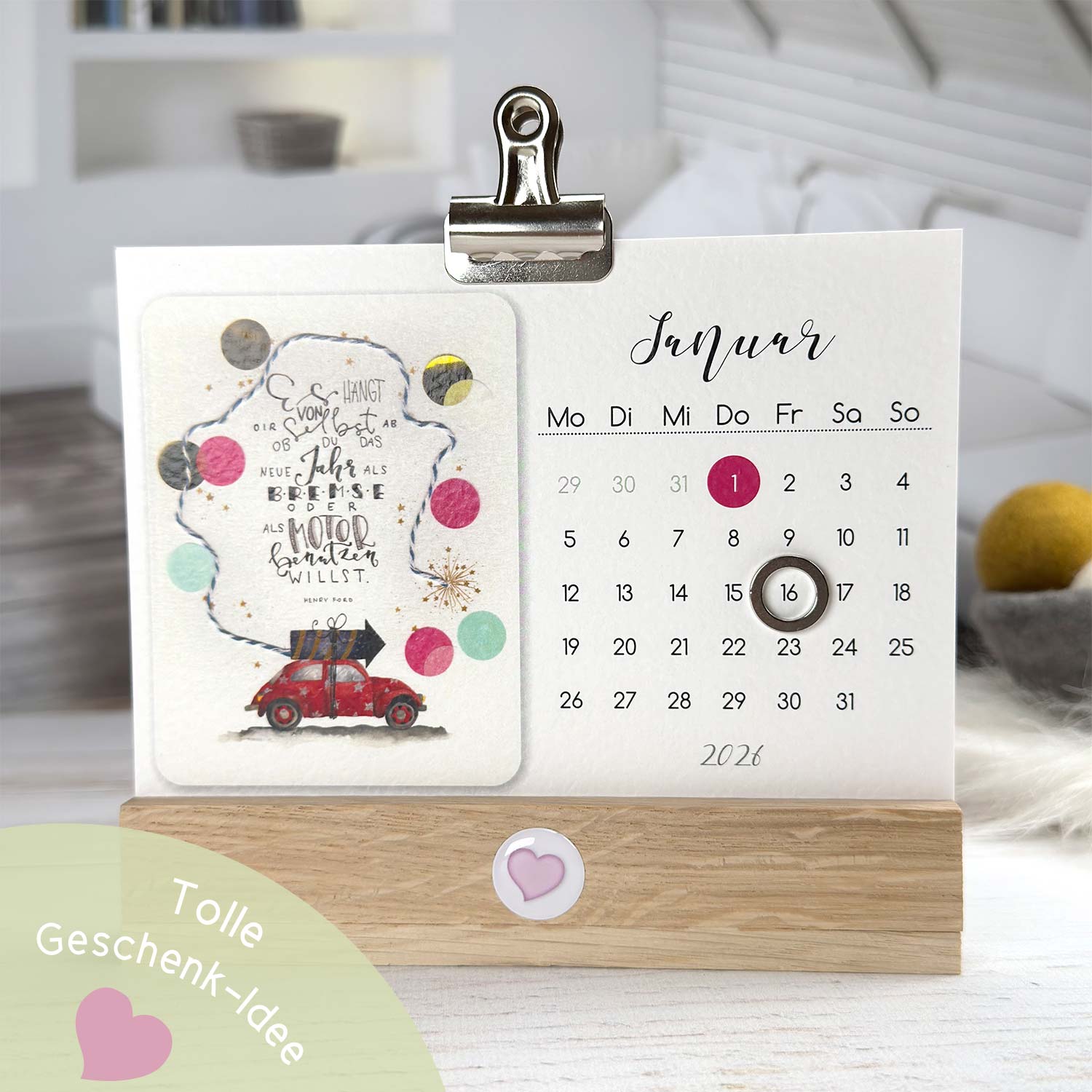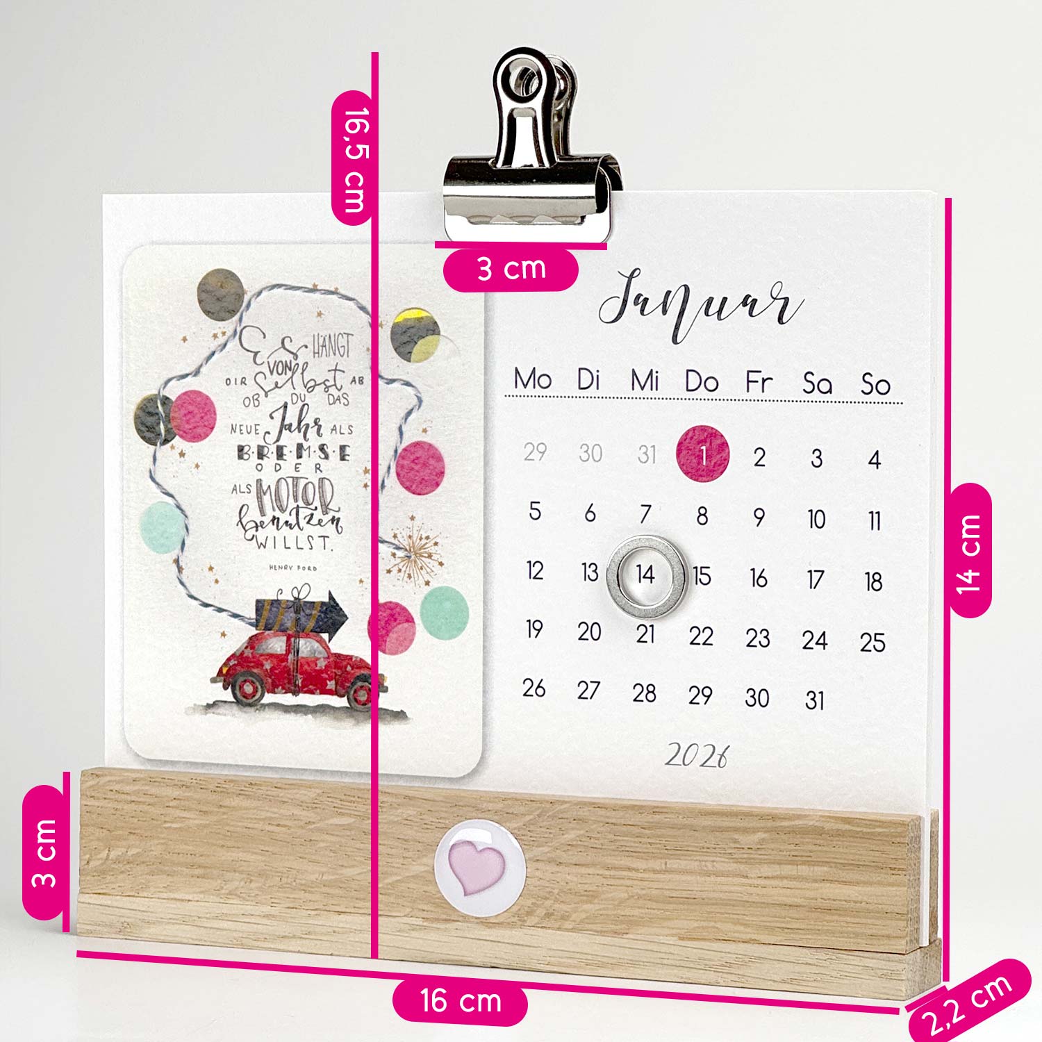 Inspiriert von unseren Kunden, haben wir die bezaubernden Illustrationen und Handletterings von Annett Wötzel für 2026 auch in einen Tischkalender integriert. Praktisch zum Aufstellen mit einem handgefertigten Eichenholz-Halter, einem magnetischem Datumsweiser und einer hochwertigen Metallklammer, hast Du immer das aktuelle Datum und einen Monat im Blick. Verschönere damit Deinen Schreibtisch und freu Dich jedes Monat über eine neues Motiv mit Handlettering, welche wir auf Feinkarton mit Hammerschlag-Optik gedruckt haben. Ein süßer 3D-Sticker mit Herzchen verziert den Holz-Ständer noch zusätzlich. Allgemein gültige Feiertage sind farbig markiert und der Monatskalender besticht durch ein klares Design. Dieser niedliche Monatskalender eignet sich hervorragend als Geschenkidee für die beste Freundin, Mama, Kollegin oder Dich selbst!