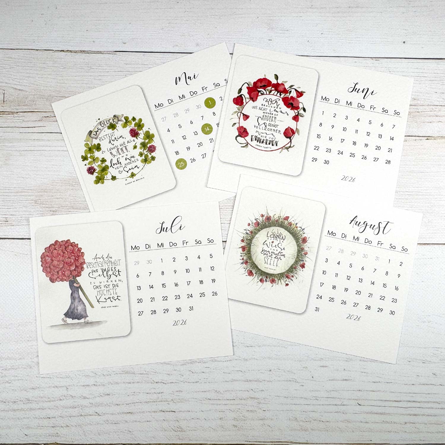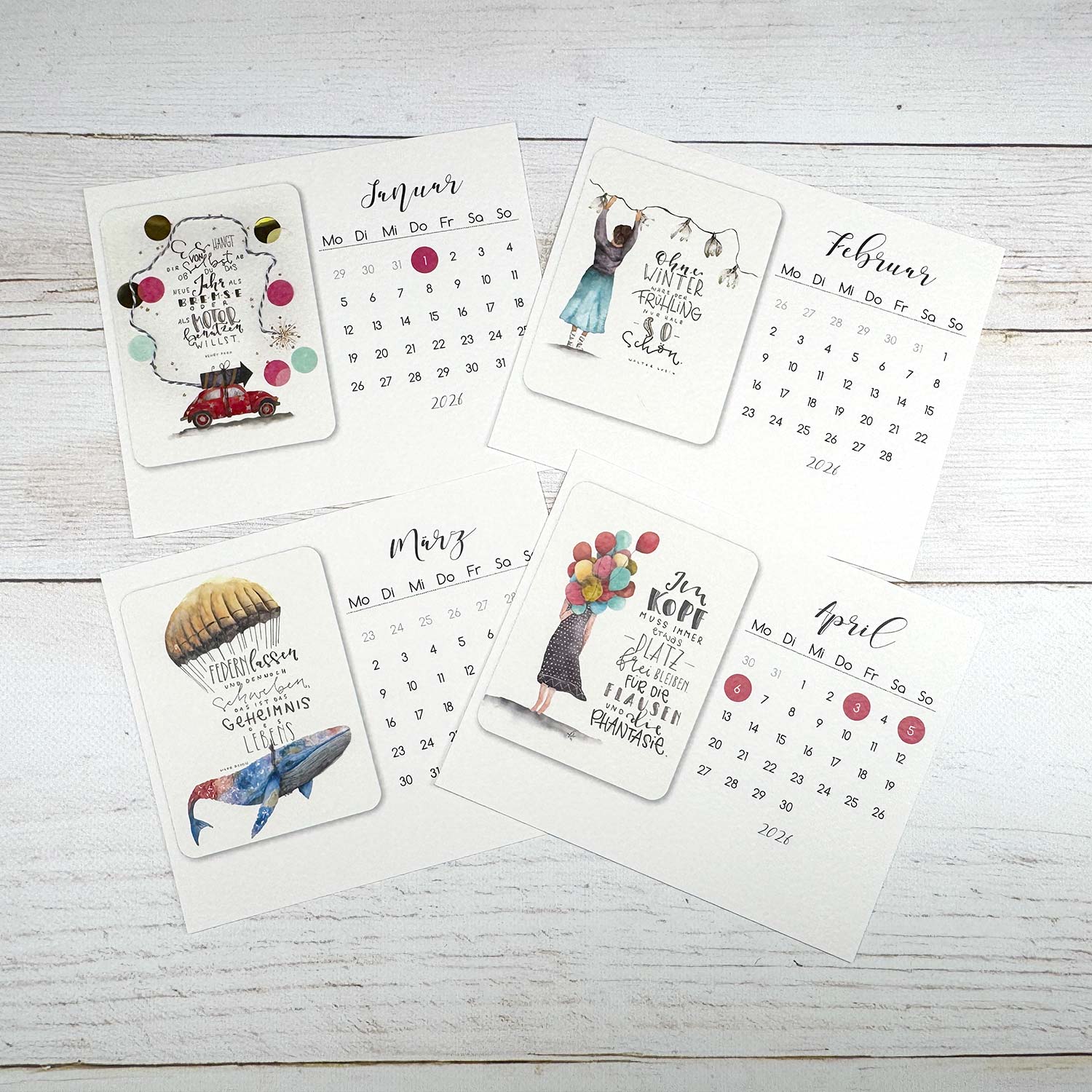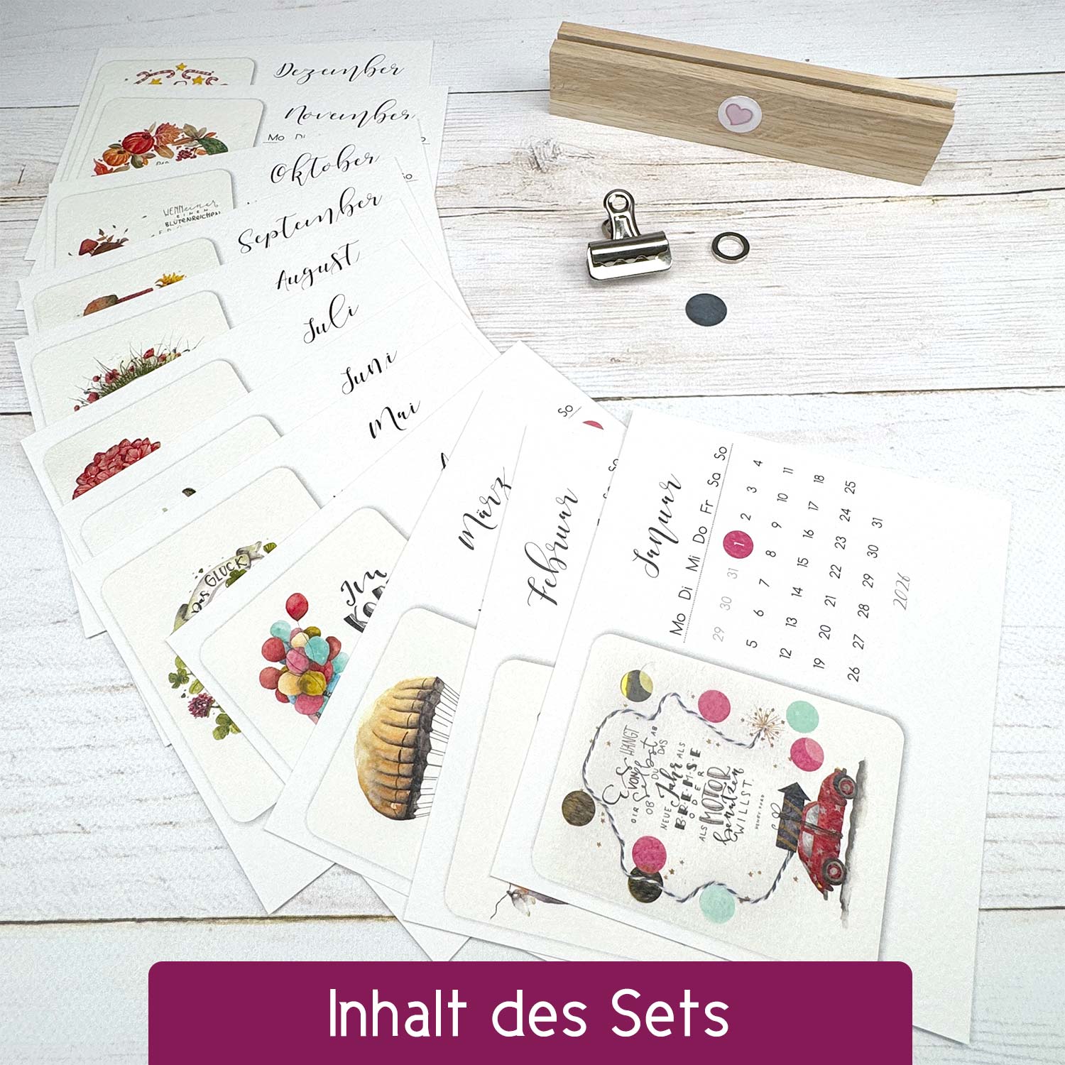 - 12 Blatt Monatskalender im Format 16 x 13 cm (1 Blatt pro Monat von Januar bis Dezember, einseitig bedruckt)