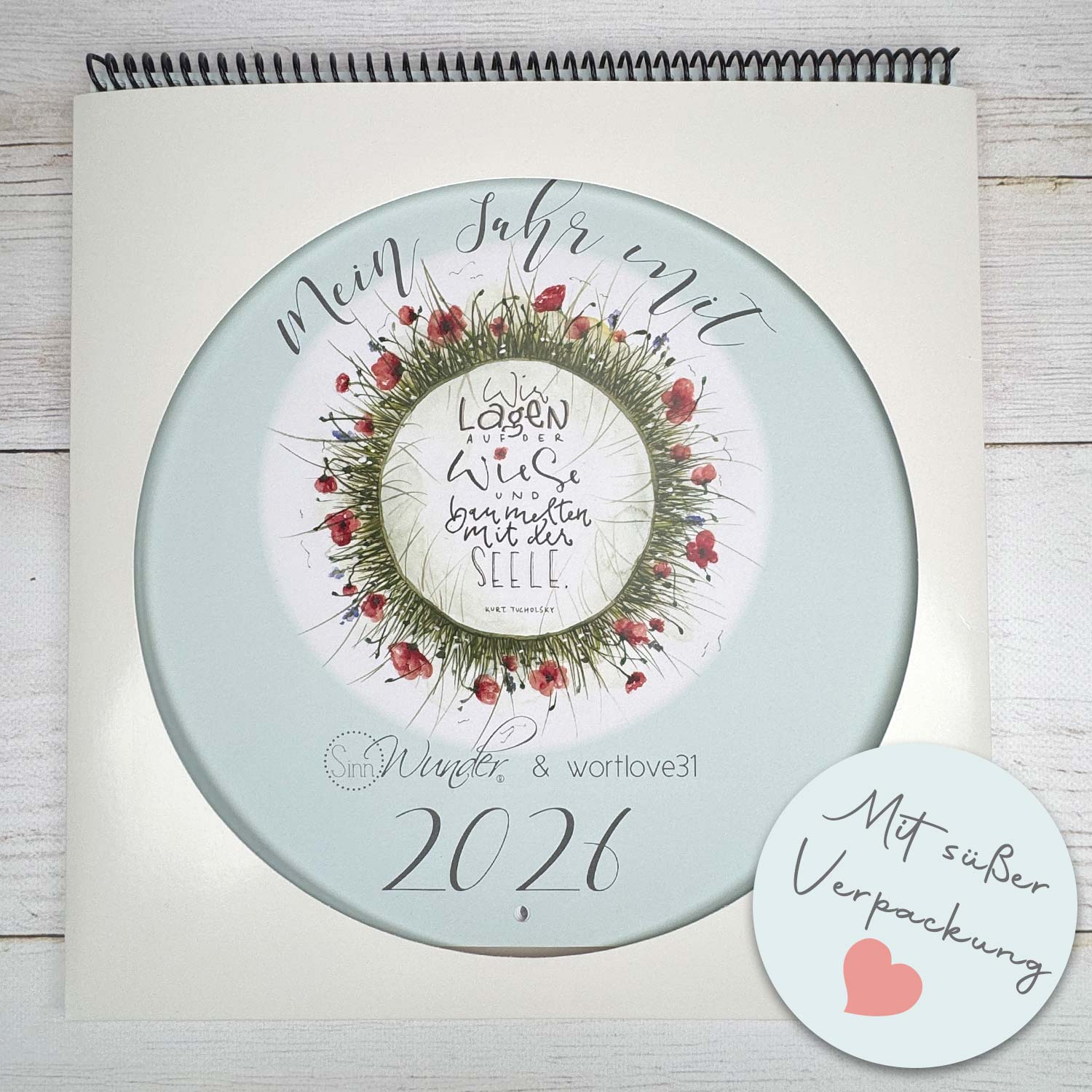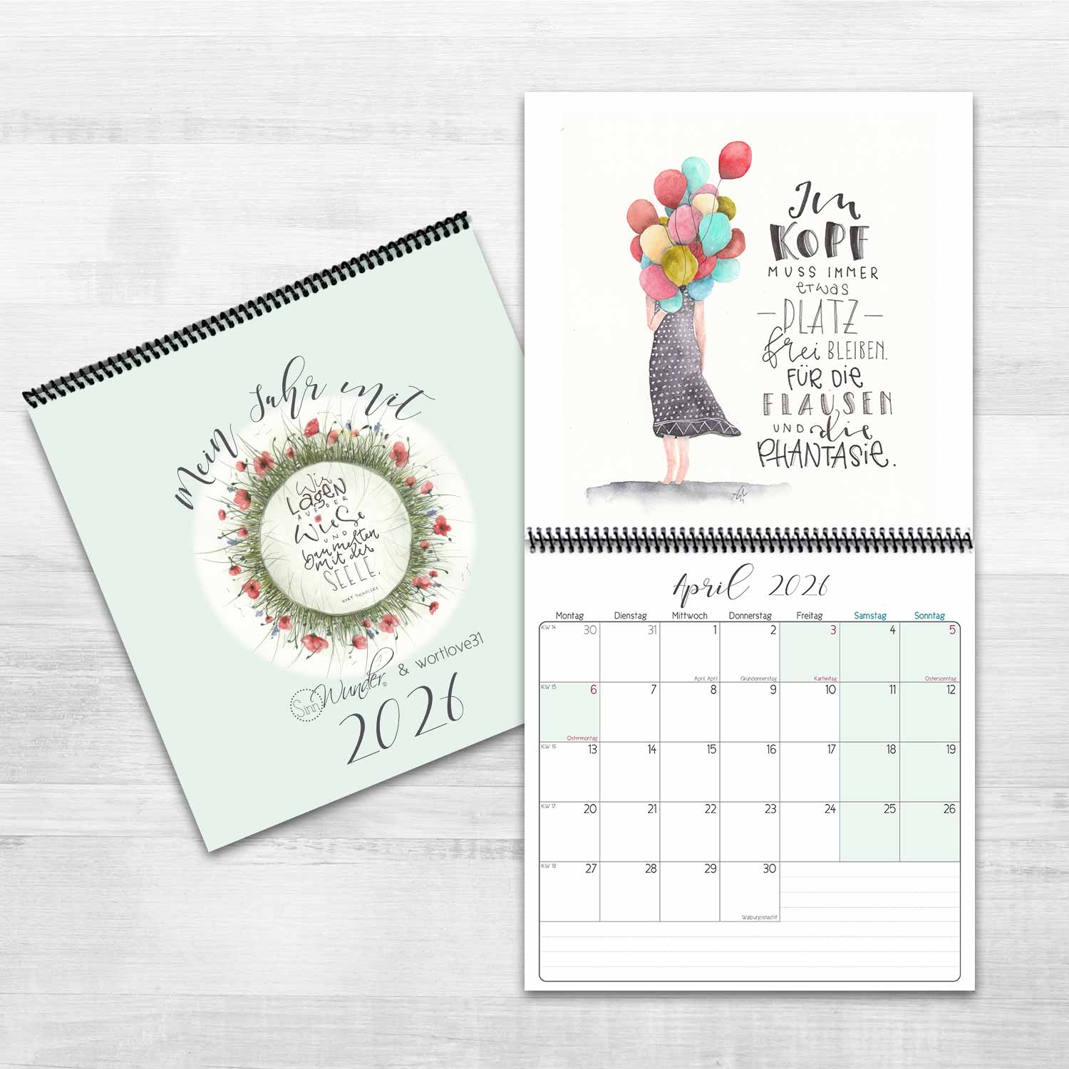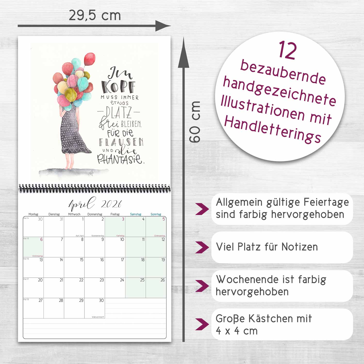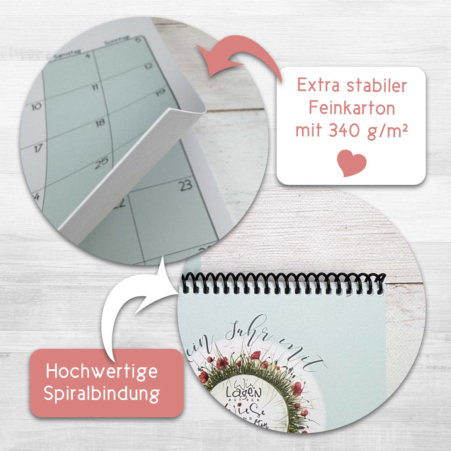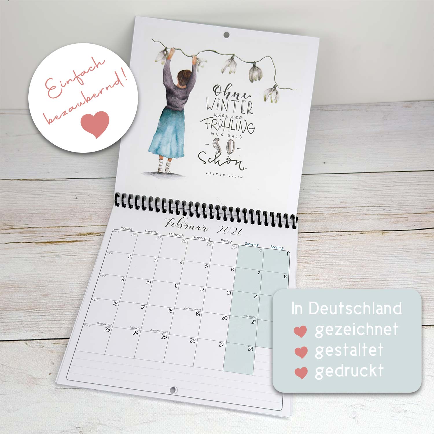 Vielleicht geht es Euch auch so, dass der Küchenkalender als "zentrale Steuerstelle" im Haus fungiert. Für Eintragungen, die alle Familienmitglieder betreffen, Geburtstage und natürlich die Termine der Müllabfuhr. Wir haben versucht dieses wichtige "Kontrollzentrum" hübsch, aber auch praktisch umzusetzen. Auf 340 g/m² Naturpapier lässt sich gut mit allen Stiften schreiben, sämtliche Feiertage für Deutschland, Österreich und die Schweiz sind enthalten, aber auch besondere Tage wie Muttertag, die Eisheiligen, Valentinstag und, und, und sind eingetragen. Kalenderwochen werden selbstverständlich angegeben und die Wochenenden farbig hervorgehoben. Die Aufteilung erlaubt die wichtigsten Eckdaten einzutragen und es gibt Platz für Notizen. Aber das Schönste an diesem Kalender sind sicherlich die wundervollen von Hand gemalten Illustrationen mit Handletterings von Annett Wötzel alias wortlove31, die Ihr vielleicht von Instagram kennt. Sie hat uns 12 wunderVolle Grafiken zur Verfügung gestellt, die wieder unserem Küchenkalender den letzten WOW-Effekt verleihen. Wir haben darauf geachtet, dass die Seite mit den Grafiken frei von jeglichen Daten sind, damit Ihr am Ende des Jahres die Möglichkeit habt, einzelne, oder alle Grafiken in einem Rahmen, als Verschönerung im Haus, aufzuhängen. Hierfür ist die hohe Festigkeit des Papiers auch wieder von großem Vorteil. Das SinnWunderTeam ist begeistert und wir hoffen, dass Ihr den Design-Kalender ebenfalls in Euer Herz schließen werdet.