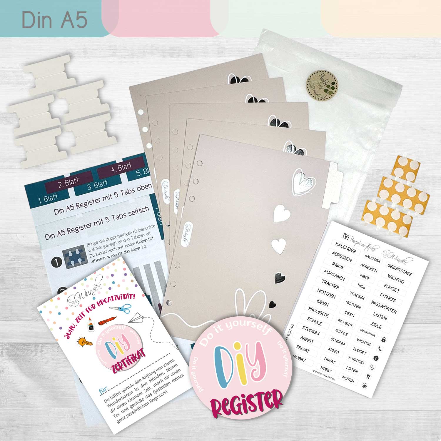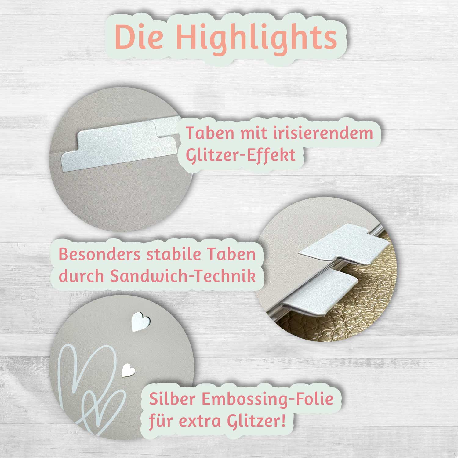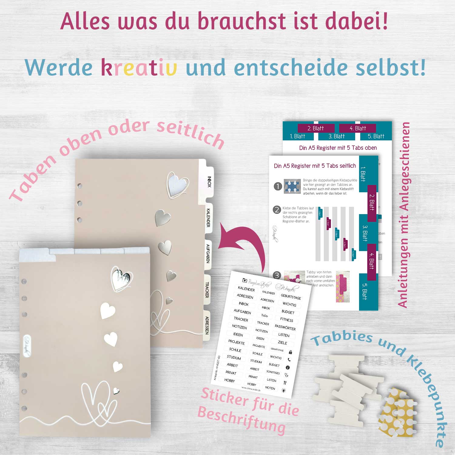DIY Register-Set "Herzen" Din A5 mit Silber-Embossing für 5 Tabs oben oder seitlich